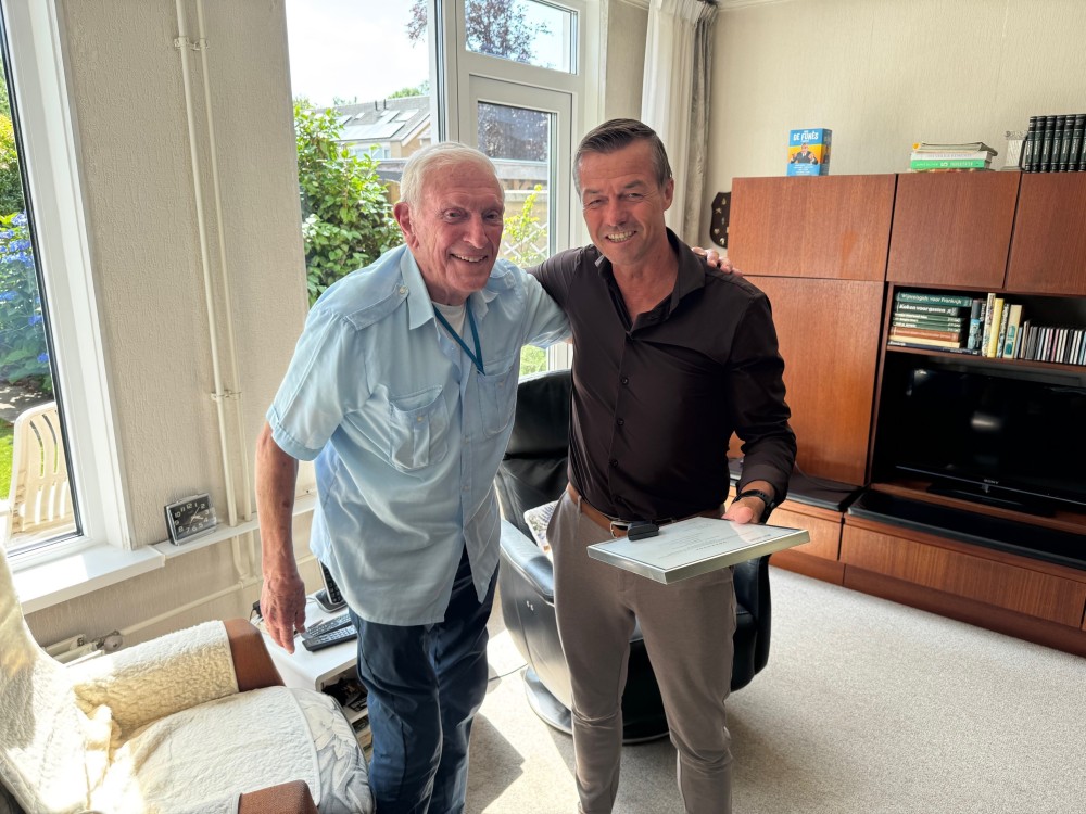 De 91-jarige Wolter de Groot uit Breda was onlangs precies 70 jaar AFMP-lid. Ter gelegenheid van deze unieke mijlpaal brachten Ruud Bergsma en Paul Engelbertink, respectievelijk voorzitter en sectorhoofd Postactieven van onze bond, op 9 juli een bezoek aan Wolter. Zij reikten hem de bijbehorende draagspeld en het jubileumcertificaat uit. Ook kreeg hij een bos bloemen uit handen van Paul.